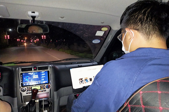 技术人员夜间采样结束后在车上成立采样信息